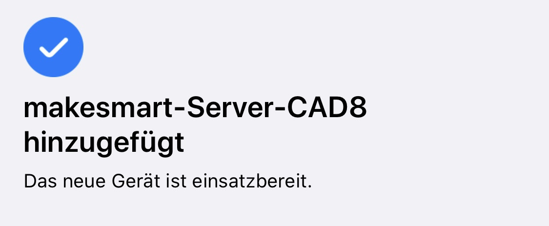 Um die Homebridge zum Zuhause hinzuzufügen, klickt man den Button Gerät hinzufügen und scannt anschließend den QR-Code vom Webinterface. Es erscheint eine Meldung, dass das Gerät nicht zertifiziert ist. Diese Meldung können wir bestätigen. Anschließend wird der makesmart-Server hinzugefügt.