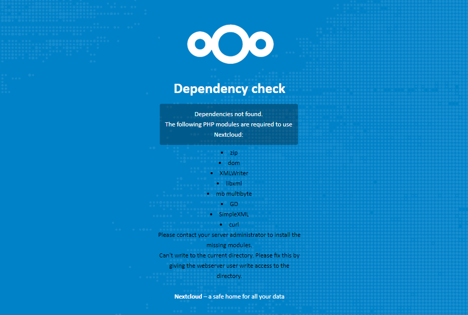 Bei mir erscheint zuerst ein Fenster "Dependency Check". Es werden alle fehlenden aber nötigen PHP-Pakete gelistet.