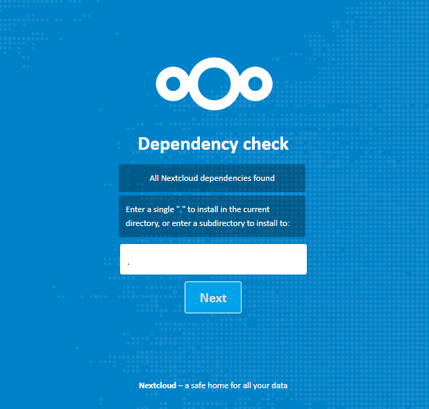 Jetzt wird gefragt in welchem Verzeichnis Nextcloud installiert werden soll. Da wir uns schon im Hauptverzeichnis des Webservers befinden, löschen wir den Placeholder in der Textbox und geben einen einzelnen Punkt ein. Das sorgt dafür, dass die Instanz in das aktuelle Verzeichnis installiert wird.