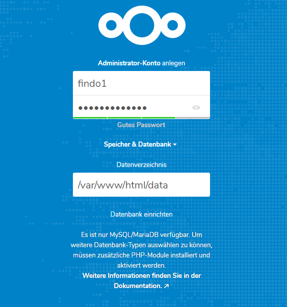 Nun fehlt nur noch ein Schritt bis zur eigentlichen Installation von Nextcloud. Die Erstellung und Konfiguration der Datenbank.