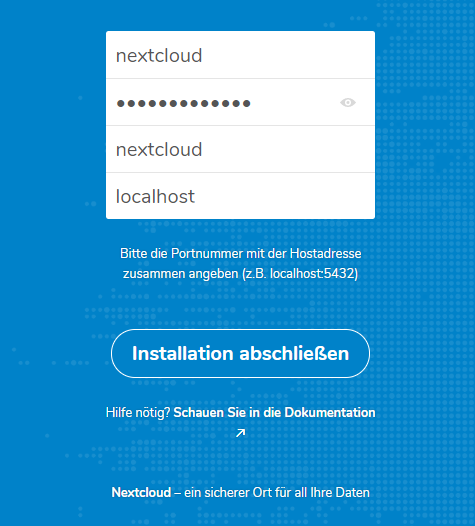 Nun legen wir unserem Admin-Account fest, den wir später für die erste Anmeldung in die Nextcloud benötigen. Das Datenverzeichnis könnt ihr so lassen. Außerdem werden die Datenbankinformationen, die wir in der Vorbereitung erstellt haben, eingetragen. Mit einem Klick auf "Installation abschließen" wird das ganze nun installiert und gespeichert. Das kann eine Weile dauern.