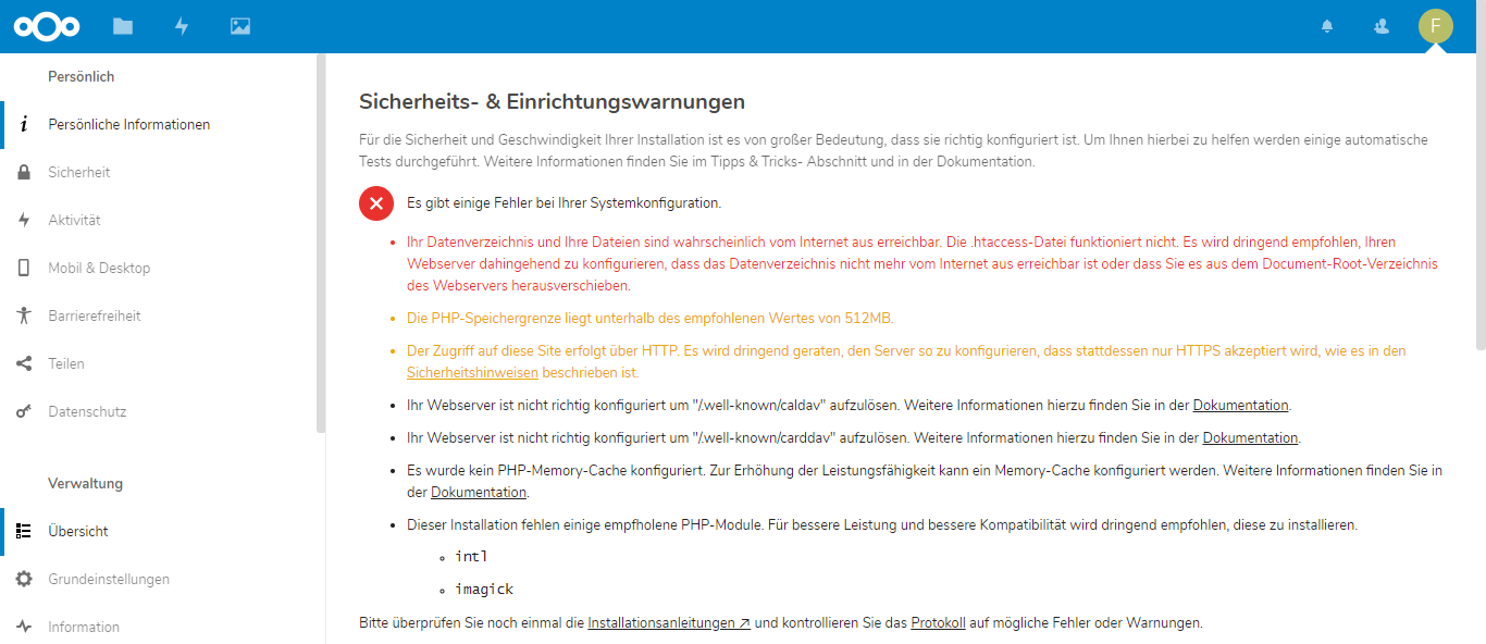 Nach der Installation und dem ersten Login mit dem Admin-Benutzer navigieren wir in die Einstellungen unter den Punkt Verwaltung auf die "Übersicht"-Seite. Auf der Seite werden Sicherheits- & Einrichtungswarnungen angezeigt, die behoben werden sollten um die Sicherheit und den vollen Funktionsumfang der Nextcloud-Instanz zu gewährleisten.
