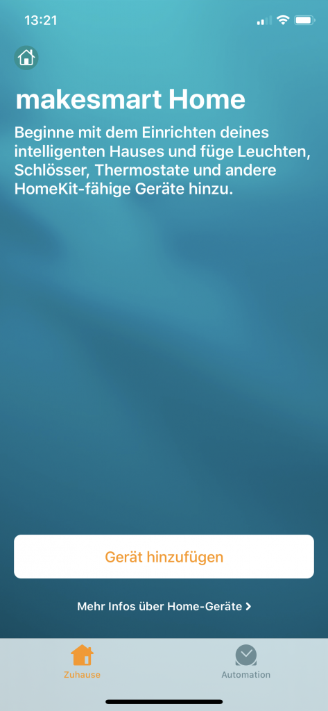 Um die Homebridge zum Zuhause hinzuzufügen, klickt man den Button Gerät hinzufügen und scannt anschließend den QR-Code vom Webinterface. Es erscheint eine Meldung, dass das Gerät nicht zertifiziert ist. Diese Meldung können wir bestätigen. Anschließend wird der makesmart-Server hinzugefügt.