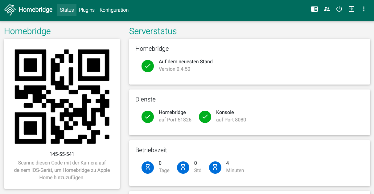 Nach 1 - 2 Minuten ist der Homebridge-Server online und kann zur Home App hinzugefügt werden.