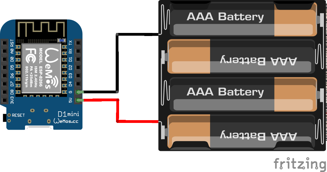 Um mit einem kurzen Beispiel zu zeigen wie einfach es ist einen ESP8266 D1 Mini ohne USB-Kabel zu betreiben, gibt es hier den Schaltplan, und zwar ganz simple mit einer 5V (4.8V) Stromquelle.
